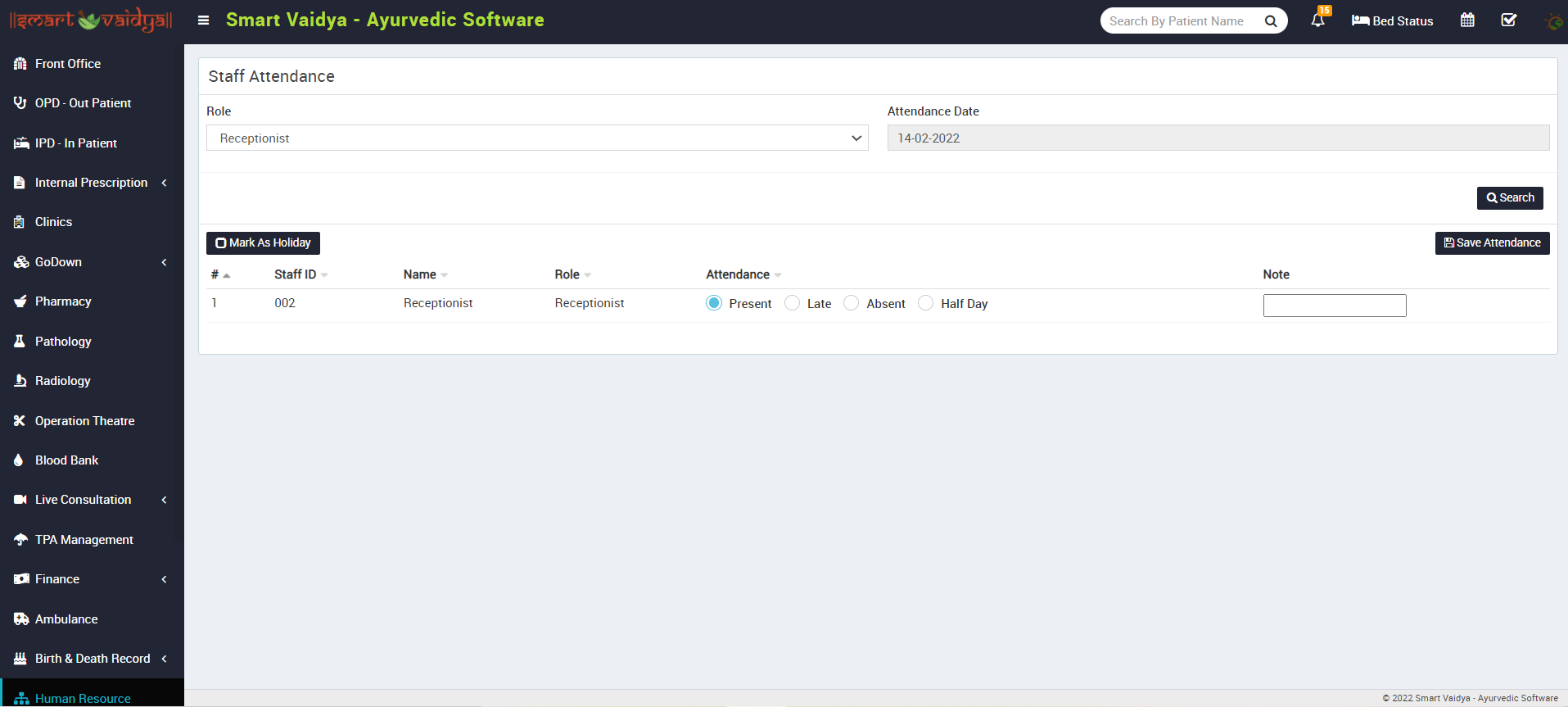 Staff Attendance management with the different status like Present, Late, Absent, Half Day